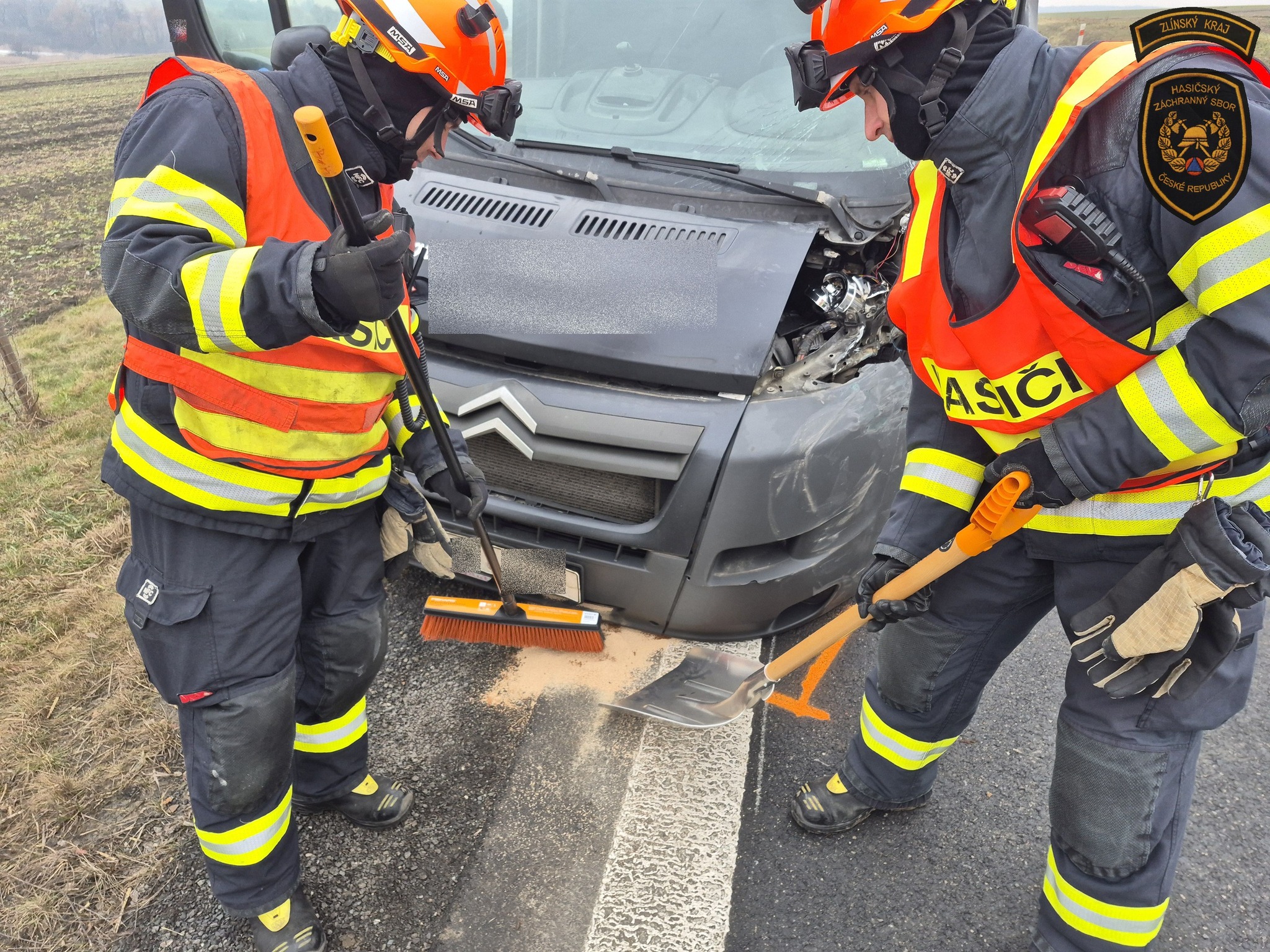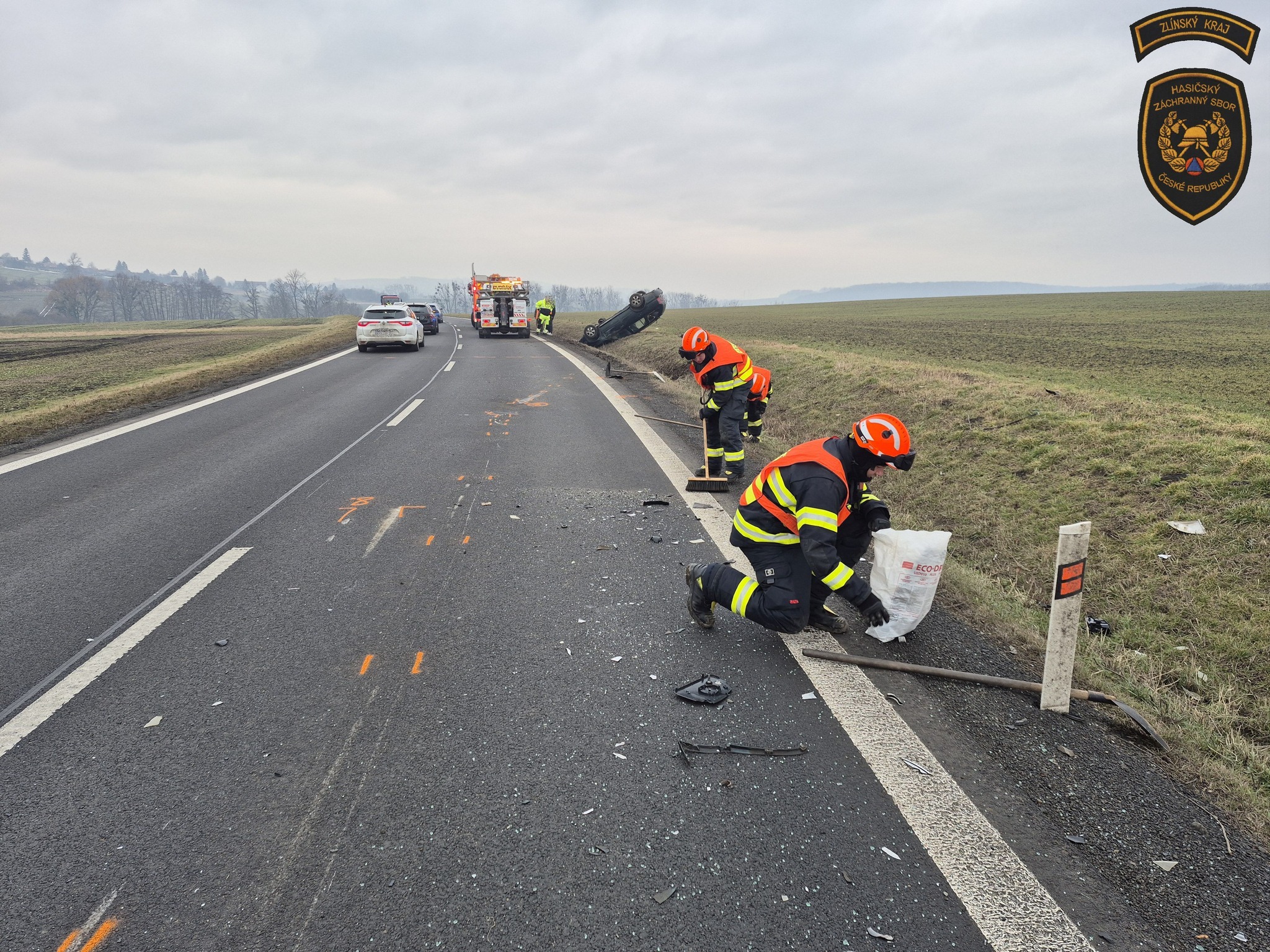 Poté hasiči provedli úklid vozovky, na které se na mnoha desítkách metrů nacházely úlomky a střepy z havarovaných vozidel.