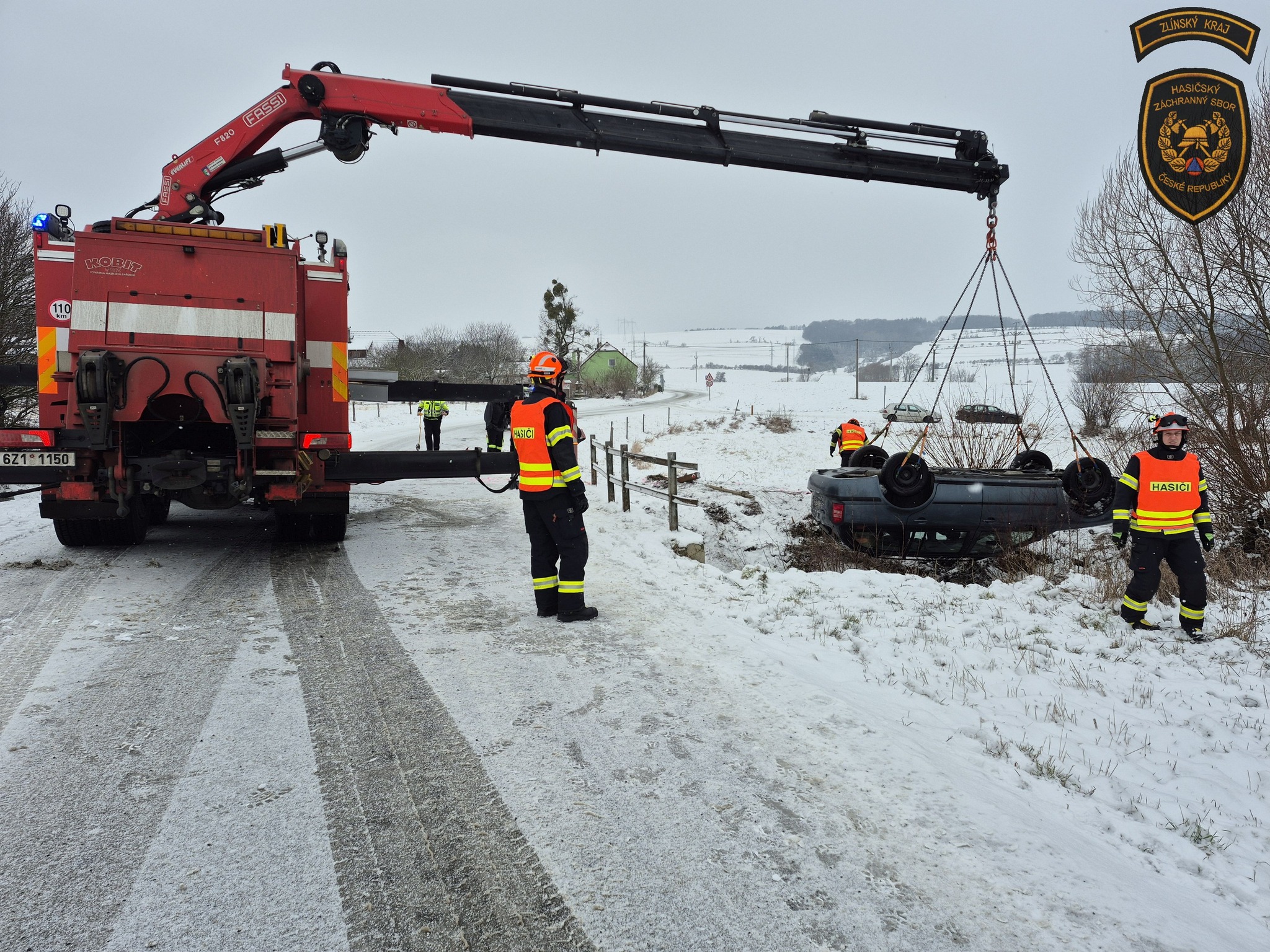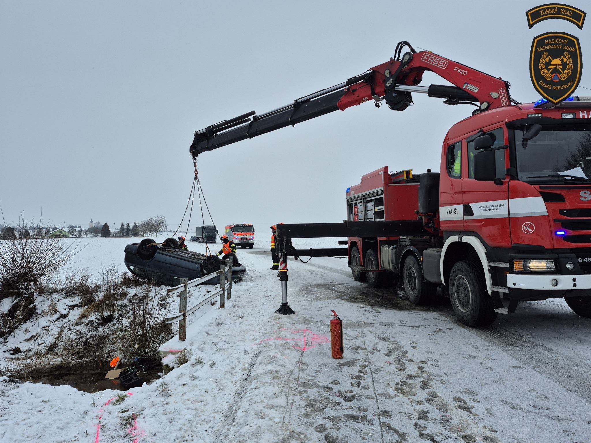 Vzhledem k poloze vozu převráceného v korytě potoka a náročnému terénu si velitel zásahu vyžádal také příjezd vyprošťovacího automobilu ze stanice Zlín. Po zadokumentování nehody ze strany policie pak mohli hasiči zahájit samotné vyproštění vraku.
