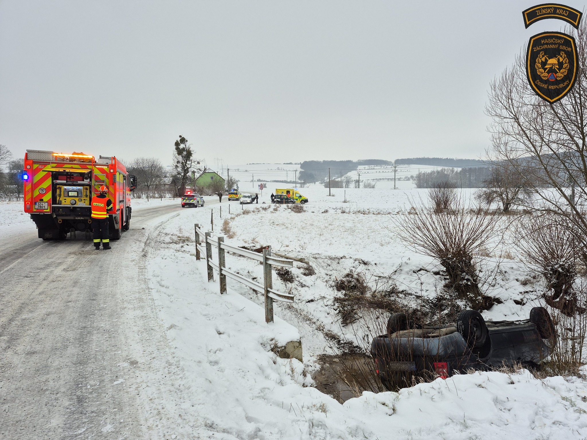 KvasiceK dramatické dopravní nehodě došlo dnes před půl osmou ráno na zasněžené silnici u Kvasic na Kroměřížsku. Řidička osobáku, se kterou v té době cestovaly také dvě děti, sjela mimo silnici, kde se auto převrátilo na střechu do koryta místního potoka. Na místě zasahovali hasiči, zdravotnická záchranná služba i policisté.