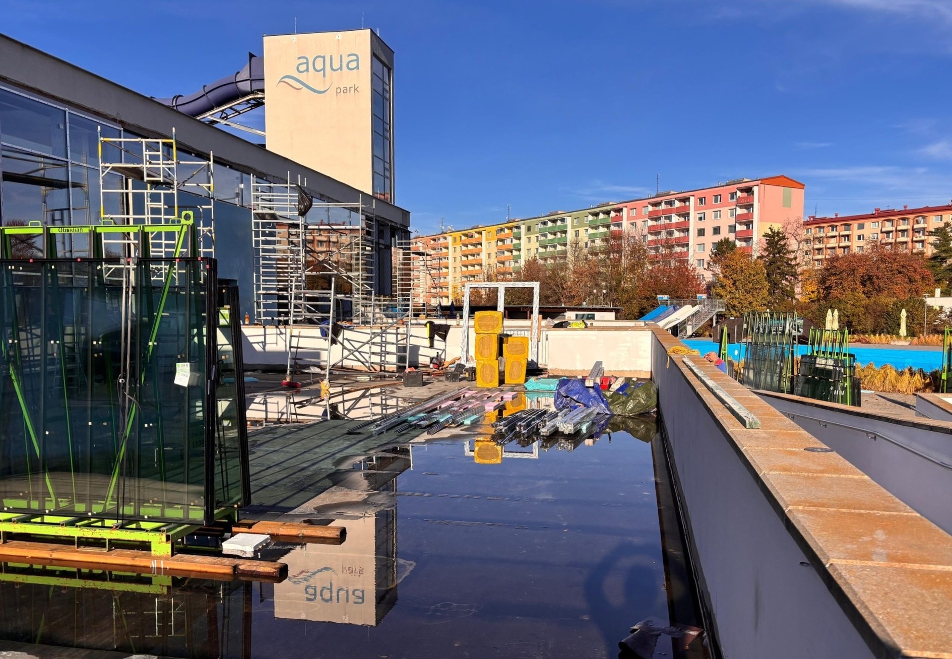 Během uplynulých dvou měsíců prošel areál aquaparku rozsáhlou obnovou, od šaten, přes výměnu fasádní prosklené stěny do letního areálu až po nové technologické opatření zvyšující energetickou efektivitu provozu. Do konce roku bude ještě dokončena rekonstrukce letní terasy a úprava fasády objektu.