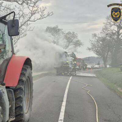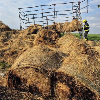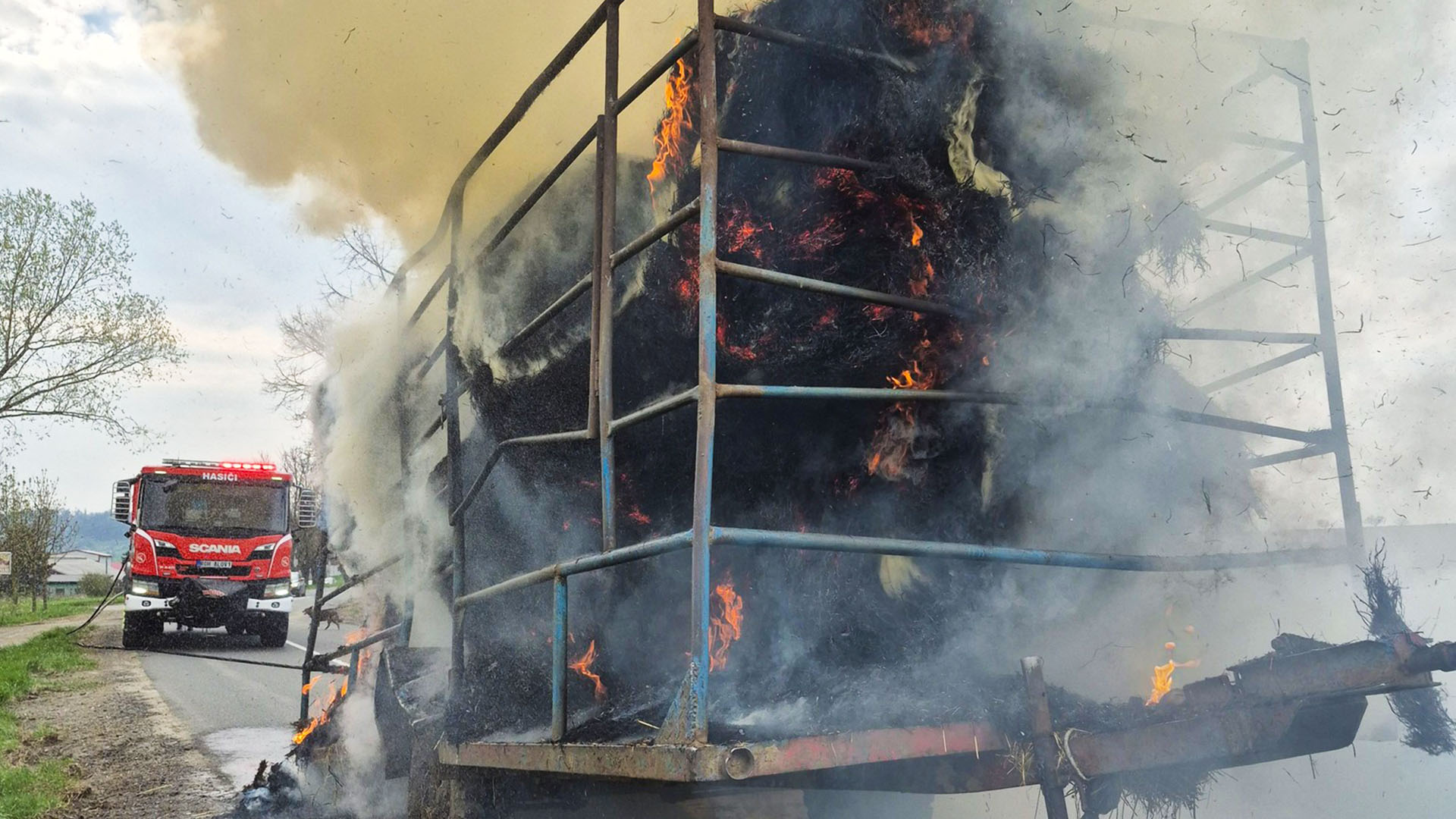 Silnici u obce Prusinovice na Kroměřížsku uzavřel ve čtvrtek krátce před půl pátou odpoledne požár vleku se senem. Hasební práce trvaly přibližně 45 minut. Příčinou požáru byla technická závada na vlečce.